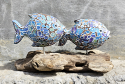 COPPIA DI PESCI KEMBUNG INTARSIATI E DIPINTI A MANO SU PIEDISTALLO DRIFTWOOD DI CM 14 CIRCA