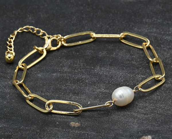 BRACCIALE DONNA CATENINA IN OTTONE GOLD PLATED CON PERLA DI FIUME CENTRALE 8 MM E MISURA REGOLABILE