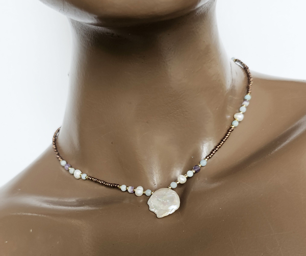 COLLANA COLLEZIONE ADIDAS CON PERLINE GIAPPONESI 12/O E GOLD PLATED, PERLE DI FIUME, PIETRE DURE AMETISTA E AMAZZONITE E PERLA PIATTA BAROK, CHIUSURA A CATENELLA REGOLABILE