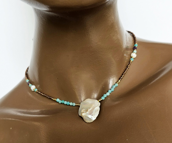 COLLANA COLLEZIONE ADIDAS CON PERLINE GIAPPONESI 12/O E GOLD PLATED, PERLE DI FIUME, PIETRE DURE AMETISTA E AMAZZONITE E PERLA PIATTA BAROK, CHIUSURA A CATENELLA REGOLABILE