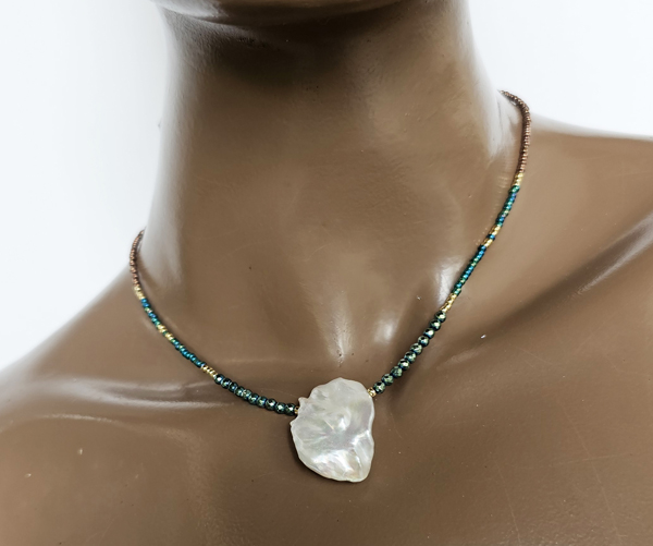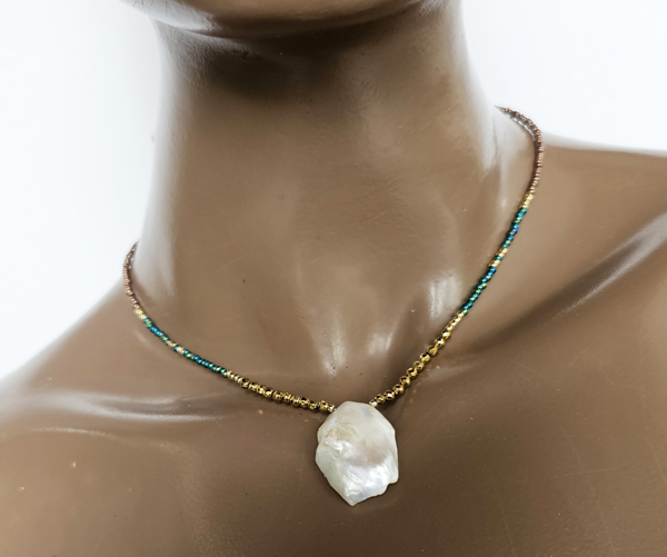 COLLANA COLLEZIONE ADIDAS CON PERLINE GIAPPONESI 12/O E GOLD PLATED, PERLE DI FIUME, PIETRE DURE EMATITE COLORATA E PERLA PIATTA BAROK, CHIUSURA A CATENELLA REGOLABILE
