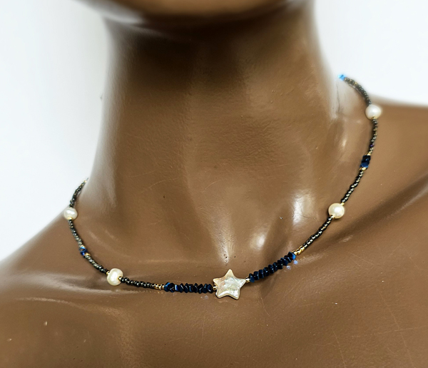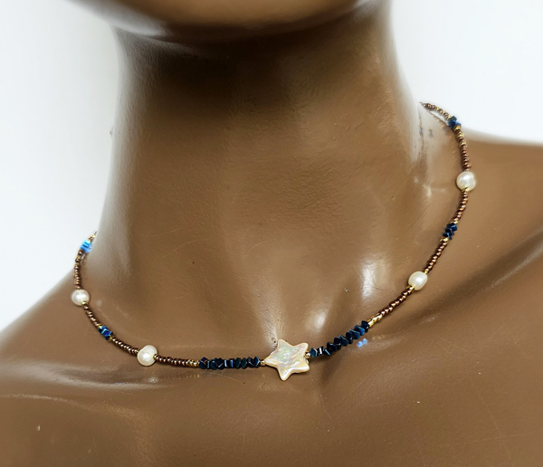 COLLANA COLLEZIONE EMATITE STONE CON PERLINE GIAPPONESI 12/0 GOLD PLATED, PERLE DI FIUME 6 MM E STELLINA BIMA, CHIUSURA IN OTTONE GOLD PLATED REGOLABILE E PIETRE IN EMATITE COLORATA