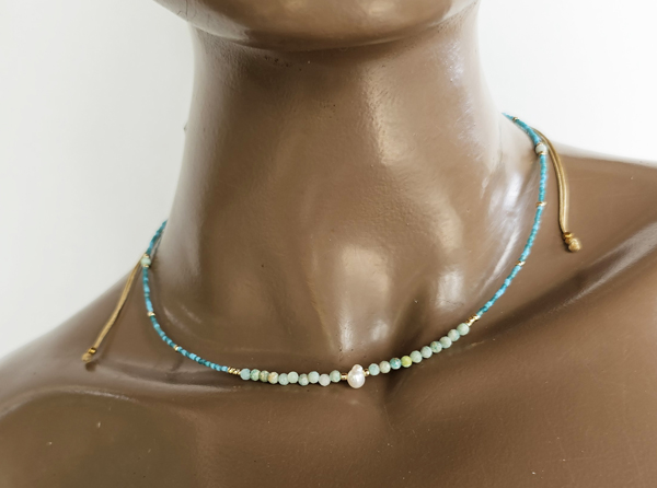 COLLANA LINEA SAMARKANDA CON PERLINE GIAPPONESI 15/O DI VETRO E GOLD PLATED, CON PIETRE SFACCETTATE 4MM E PERLA DI FIUME 6MM CON CHIUSURA REGOLABILE