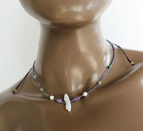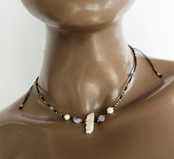 COLLANA LINEA SAMARKANDA CON PERLINE GIAPPONESI 15/O IN VETRO E GOLD PLATED, CON PIETRE DURE AMETISTA E AFRIKAN TURKISH, PERLE DI FIUME CON BIMA, CON CHIUSURA REGOLABILE