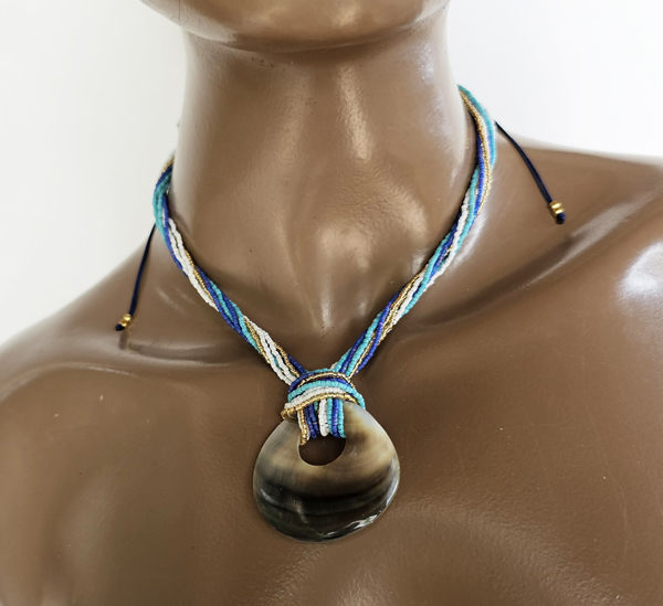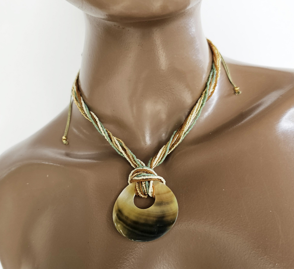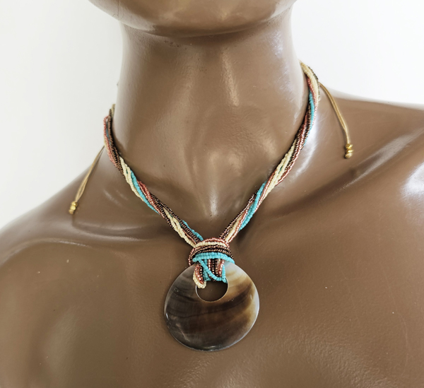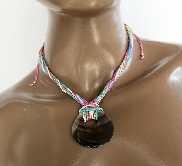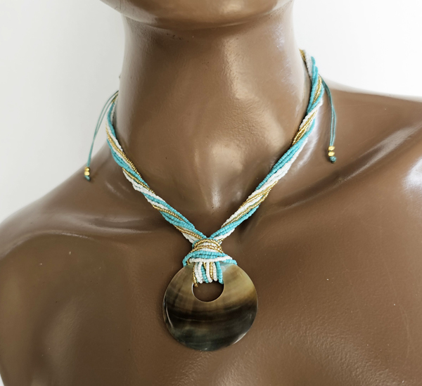 COLLARINO IN PERLINE GIAPPONESI MGB 15/0 CON 8 FILI E CIONDOLO DI MADREPERLA RONDO CM 4