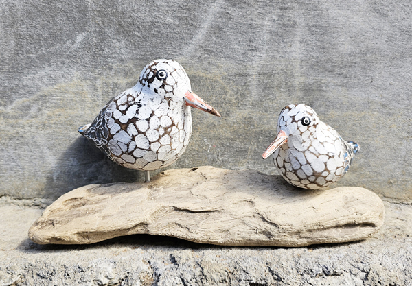 COPPIA DI PICCOLI DI GABBIANO COLORATI ED INTARSIATI A MANO SU DRIFTWOOD