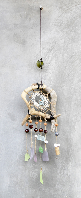 DREAM CATCHER IN DRIFTWOOD CORDA IN JUTA , COTONE E PERLINE IN LEGNO E VETRO RECICLATO