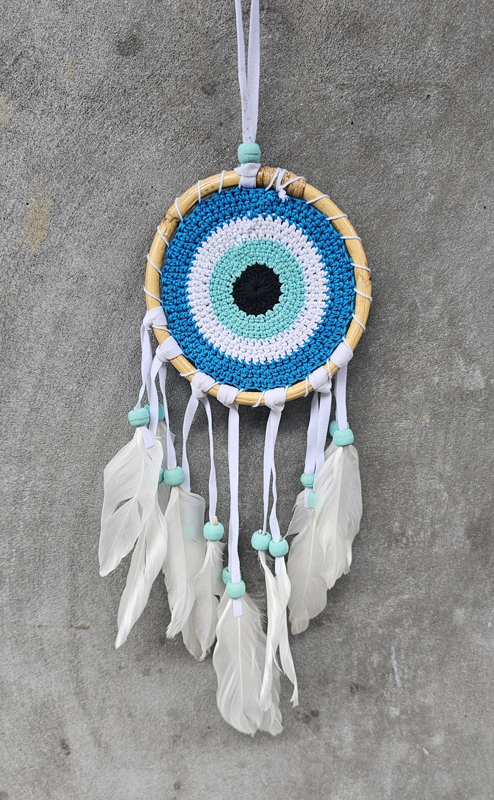 DREAM CATCHER UNCINETTO CON PIUME MOTIVO DEVIL EYE DENTRO CERCHIO RATTAN CM 11,5X32