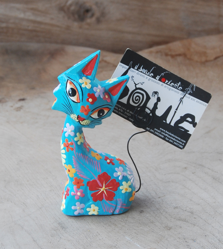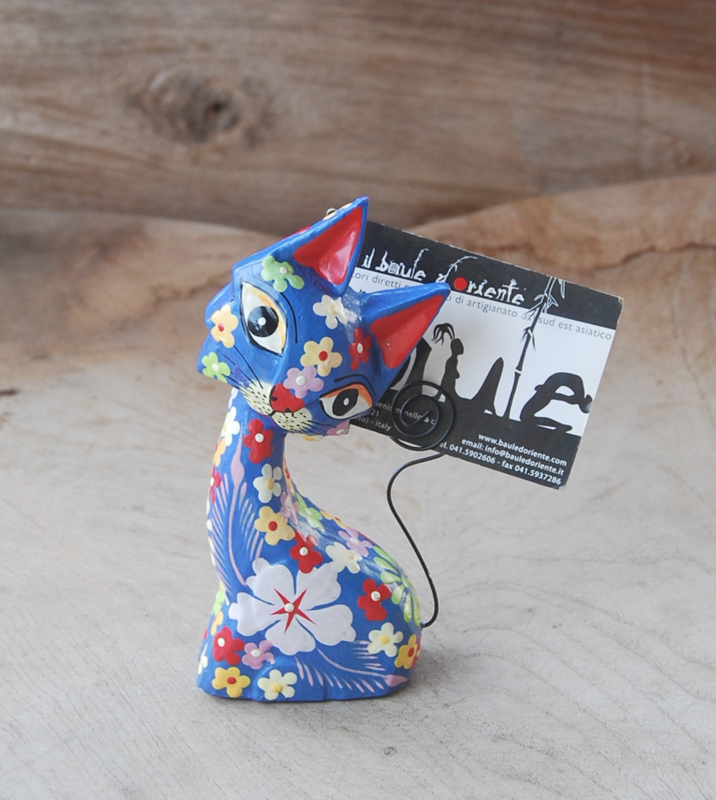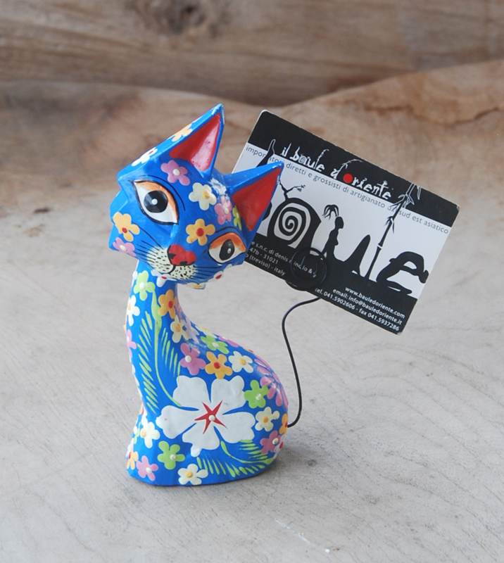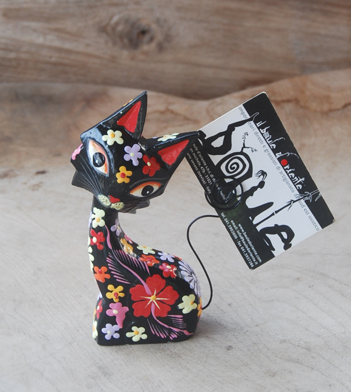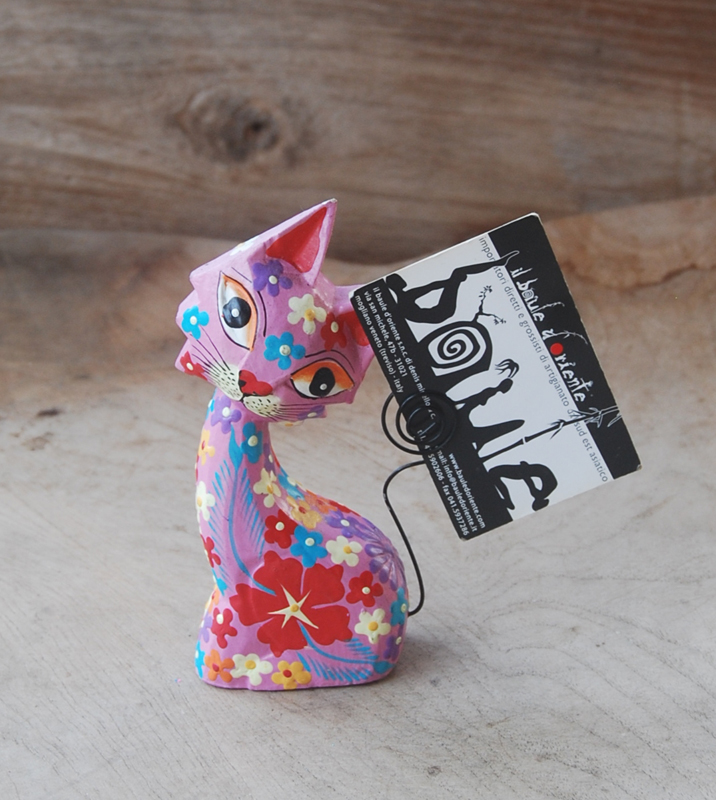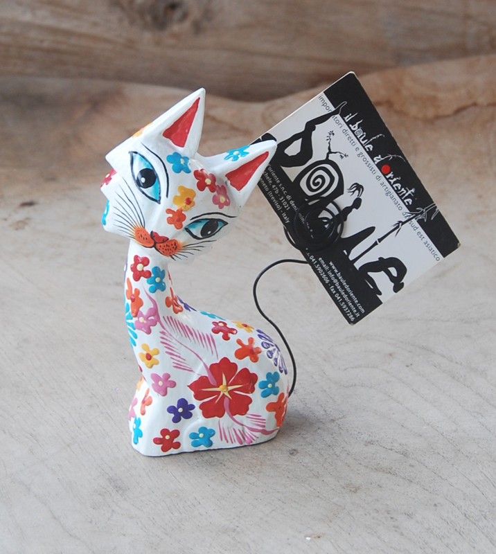 GATTO SEDUTO DI LATO IN LEGNO DIPINTO A FIORI CON CODA PORTA BIGLIETTINO CM 15