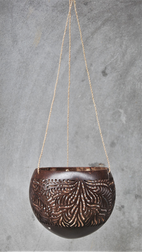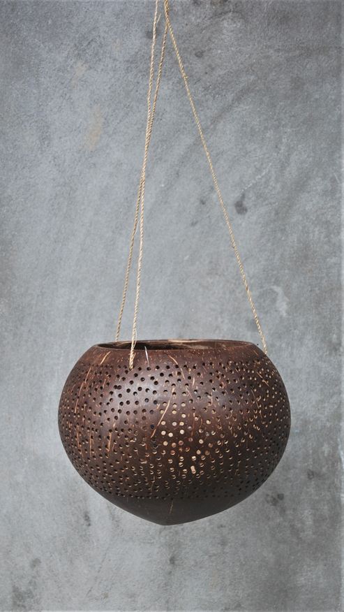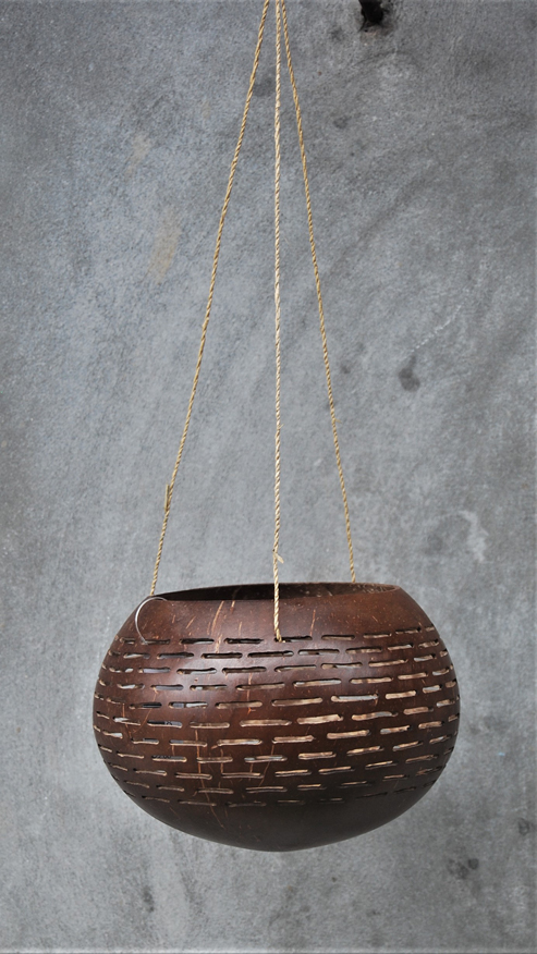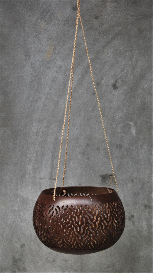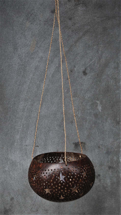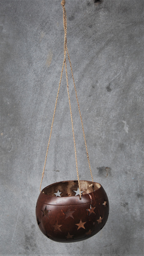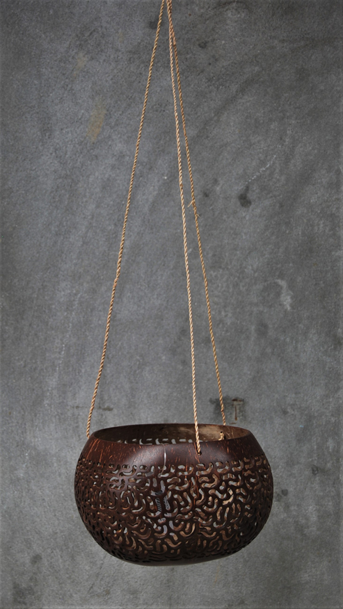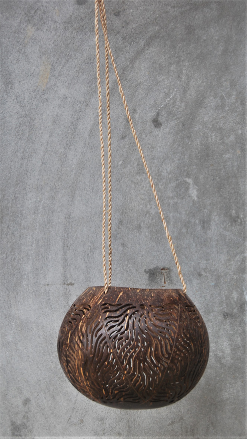 LANTERNA PORTACANDELE IN NOCE DI COCCO NATURALE GRANDE CON MOTIVO FIORI