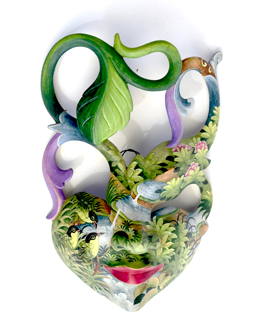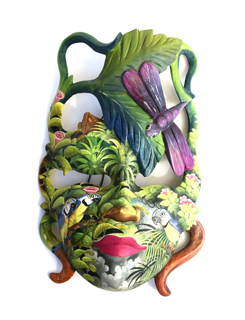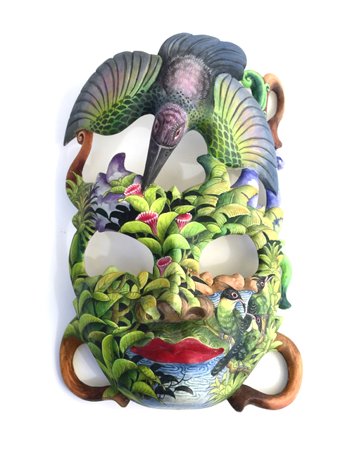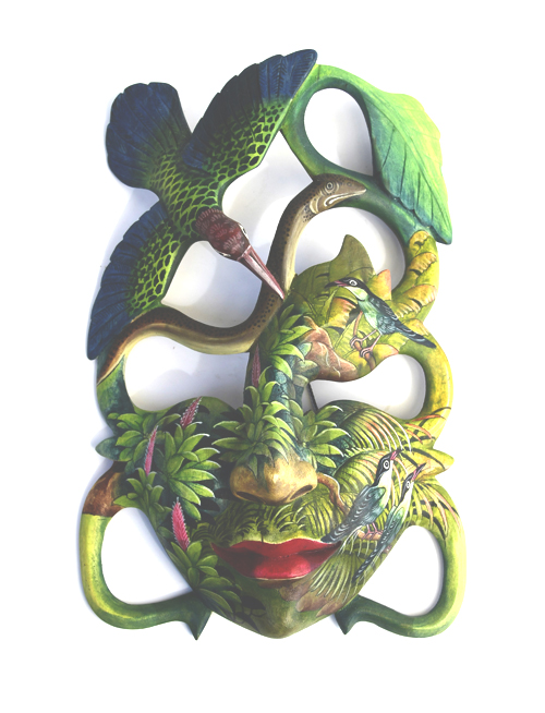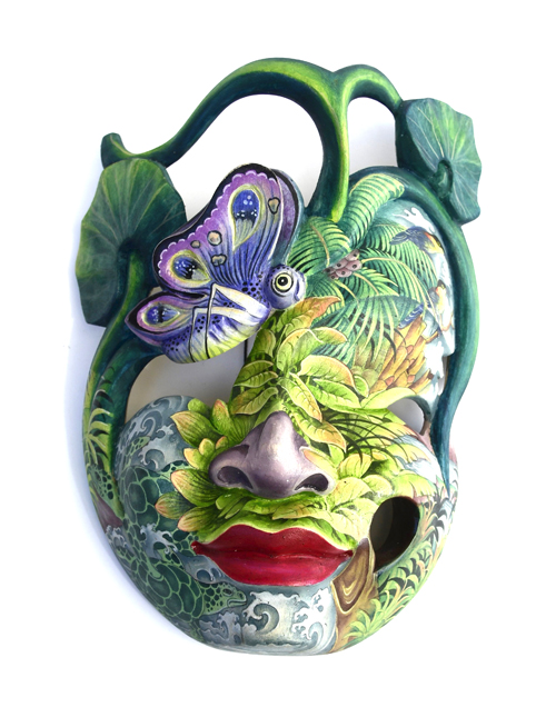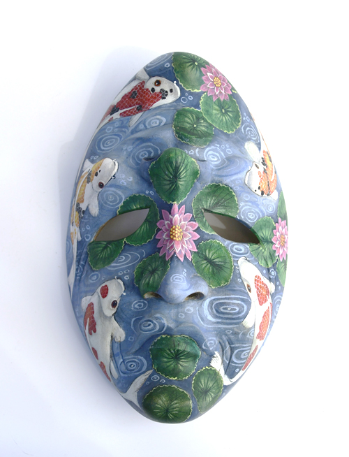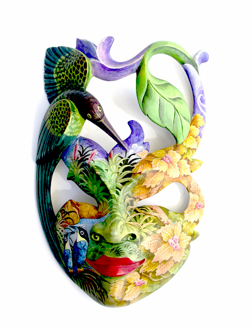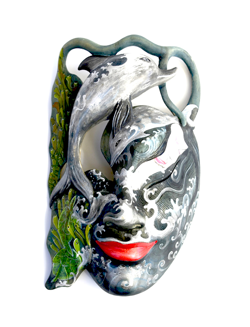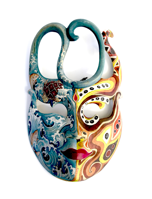 MASCHERA DIPINTA D’AUTORE (SCONOSCIUTO) IN LEGNO DI HIBISCUS CON ACQUARIO E FIORE DI LOTO CM 22/25
