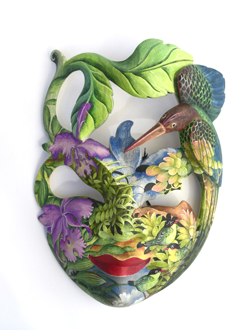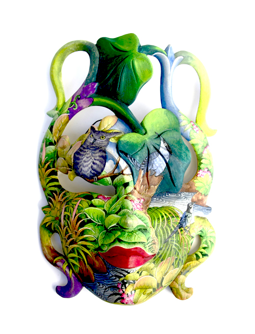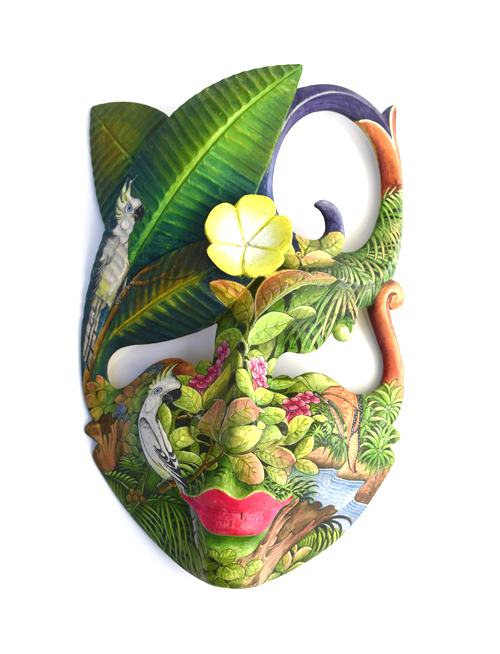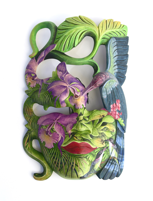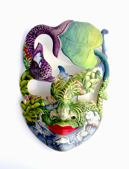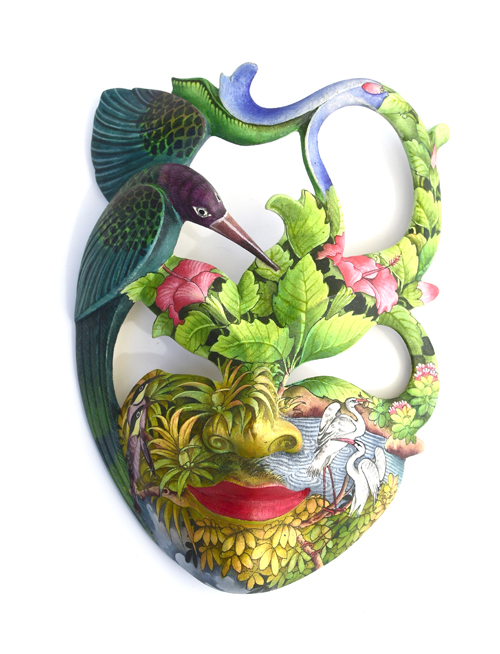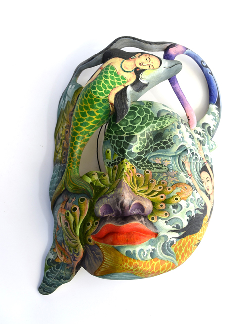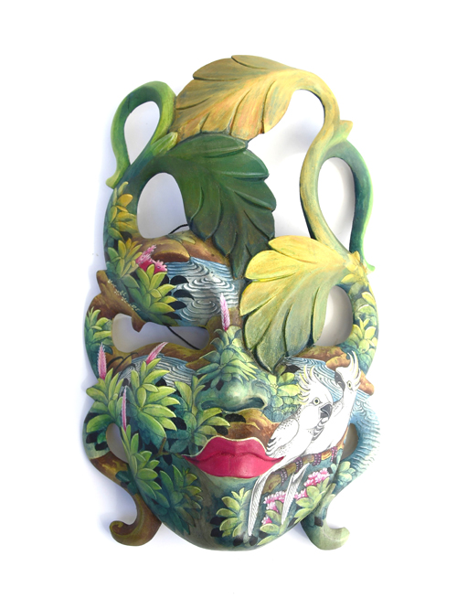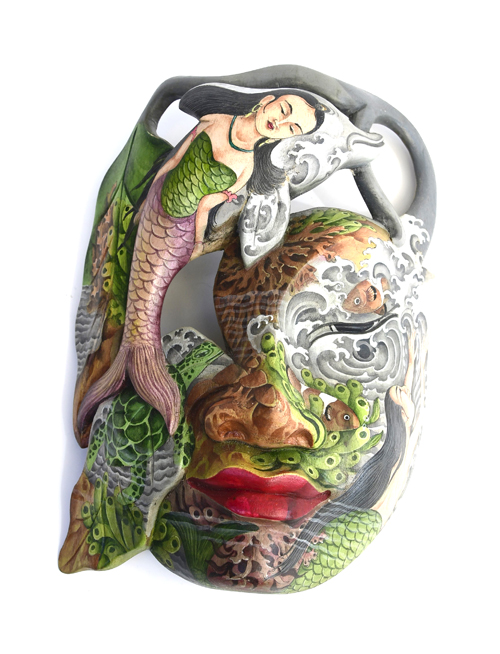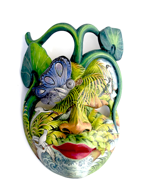MASCHERA DIPINTA D’AUTORE (SCONOSCIUTO) IN LEGNO DI HIBISCUS CON ACQUARIO E FIORE DI LOTO CM 22/25