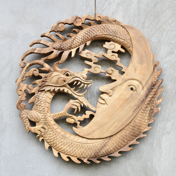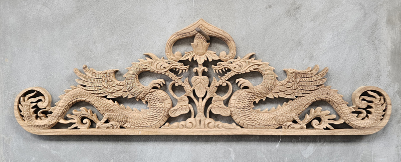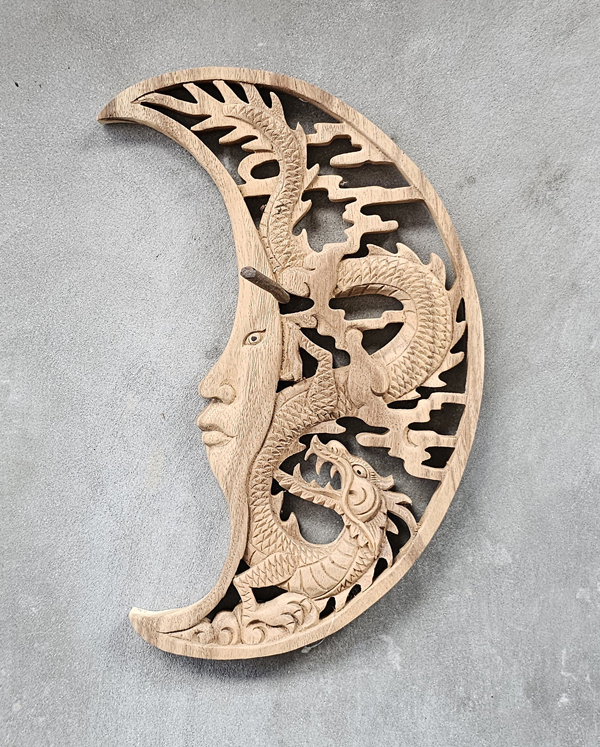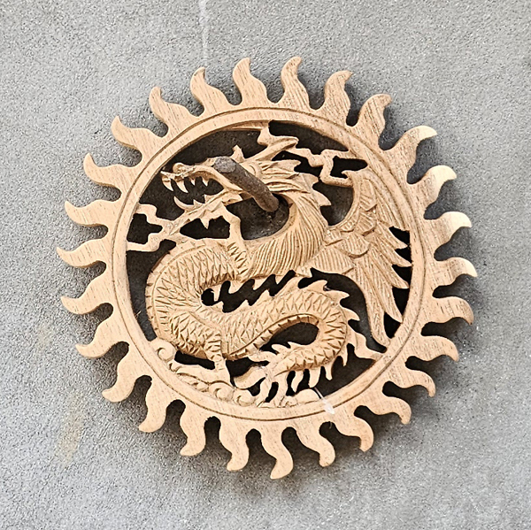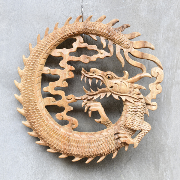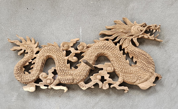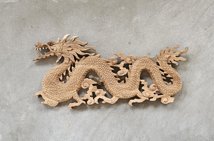 PANNELLO IN LEGNO TRAFORATO ED INTARSIATO A FORMA DI DRAGO CM 50X28