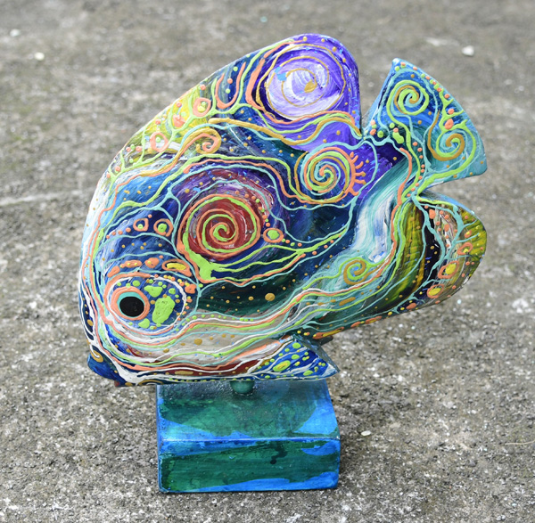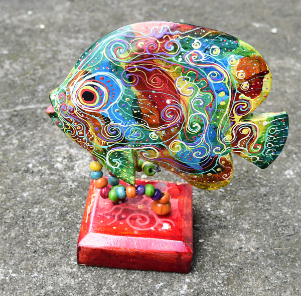 PESCE IN LEGNO DIPINTO BASCULANTE SU PIEDISTALLO CM 22X20