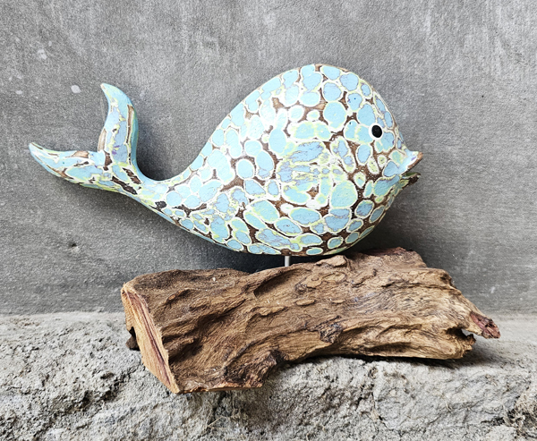 PESCE INTARSIATO E DIPINTO A MANO CON COLORI ASTRATTI SU PIEDISTALLO IN DRIFTWOOD DI CM 21 CIRCA